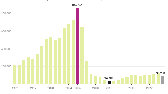 Les permis de construire pour les logements neufs ont atteint 90 250 unités jusqu’en août, soit une hausse de 7,6 % par rapport à la même période l’an dernier (83 904 unités enregistrées), selon les dernières données publiées par le ministère des Transports et de la Mobilité durable. C’est la cinquième année consécutive que le nombre de permis dépasse les 100 000 unités.