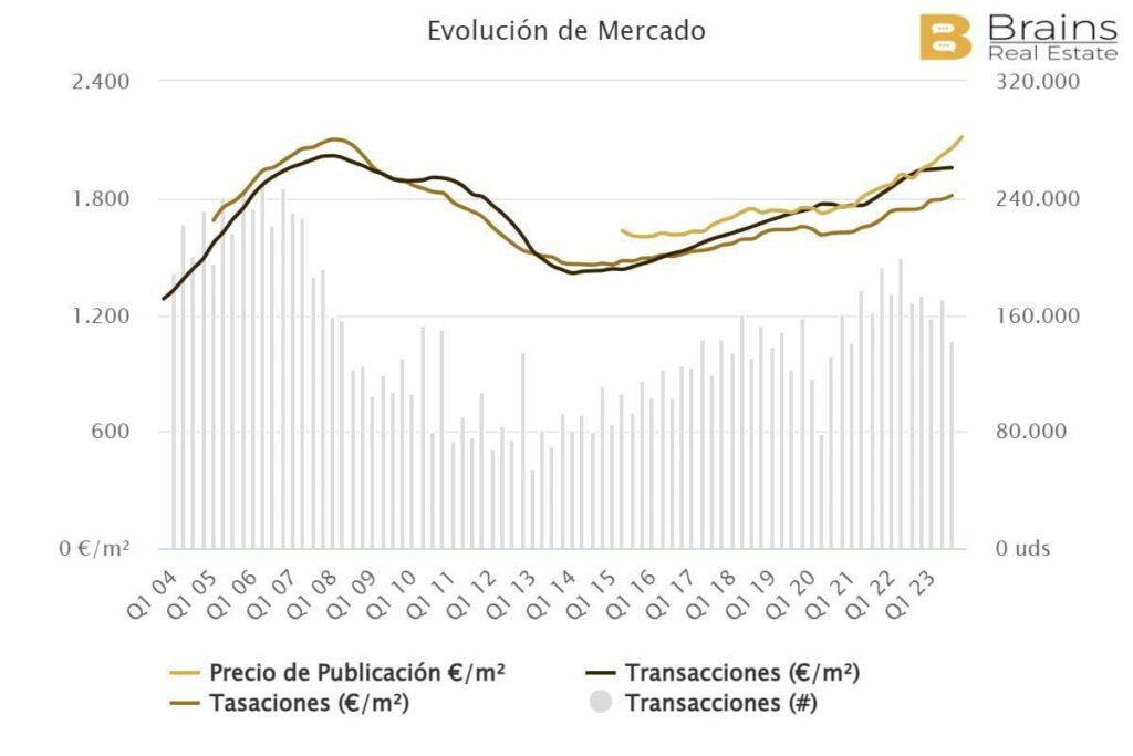 Le prix de vente des logements en Espagne n’a cessé d’augmenter depuis le 3ème trimestre 2022, s’établissant actuellement à 2.114 € par m2. Au cours des 12 derniers mois, les prix ont augmenté de 8,4%, tandis qu’en glissement trimestriel, ils ont progressé de 2,8%, selon les données obtenues auprès de la plateforme de big data immobilière Brainsre.