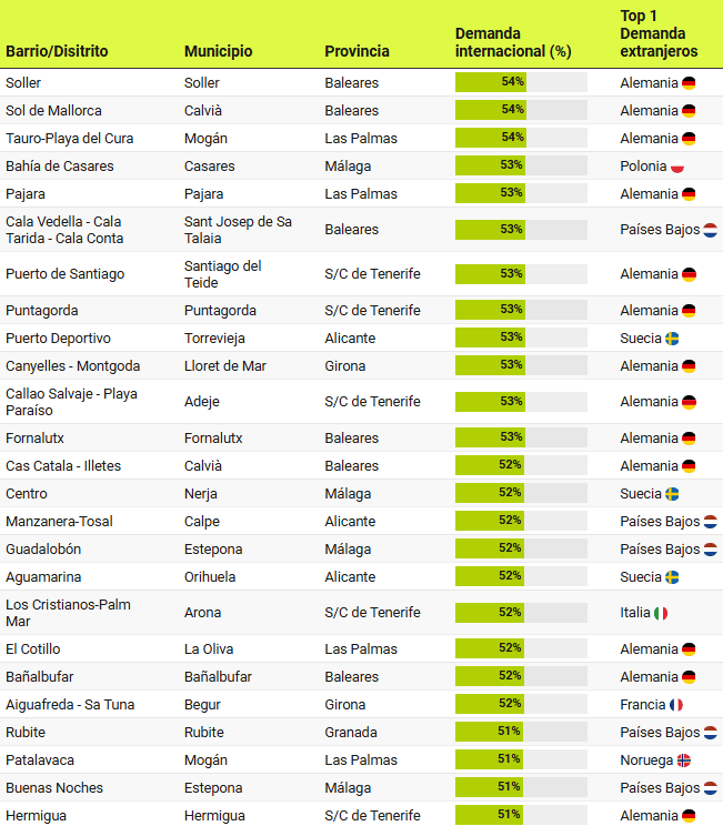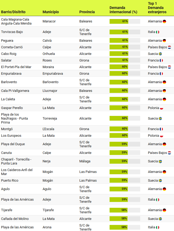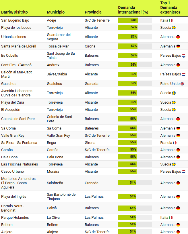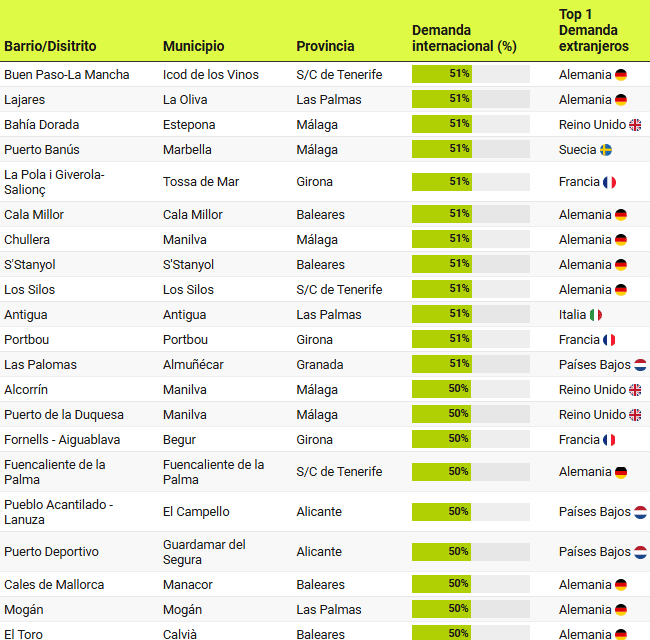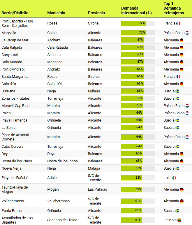 Un peu plus de 120 localités réparties dans différentes communes, quartiers et districts de 7 provinces de la côte et des îles espagnoles représentent plus de 50% de l’intérêt d’achat étranger, atteignant plus de 70% dans les districts de Port Esportiu – Puig Rom – Canyelles de Roses, à Girona; ou le district de Maryvilla, à Calpe (Alicante).