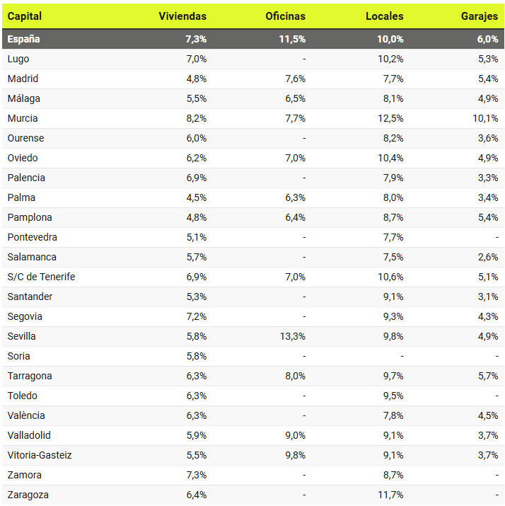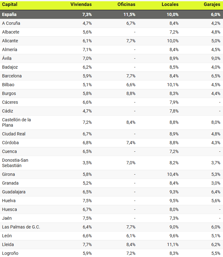 Les rendements les plus élevés sont obtenus à Séville (13,3%), Vitoria (9,8%), Saragosse (9,5%), Valladolid (9%), Burgos (8,8%), Castellón de la Plana et Lleida (8,4% dans les deux cas). La rentabilité de Tarragona est également inférieure à 9%, avec 8%, ainsi que Las Palmas de Gran Canaria, Alicante, Barcelona et Murcia (7,7% dans les 4 cas). À Madrid, elle est de 7,6 %.