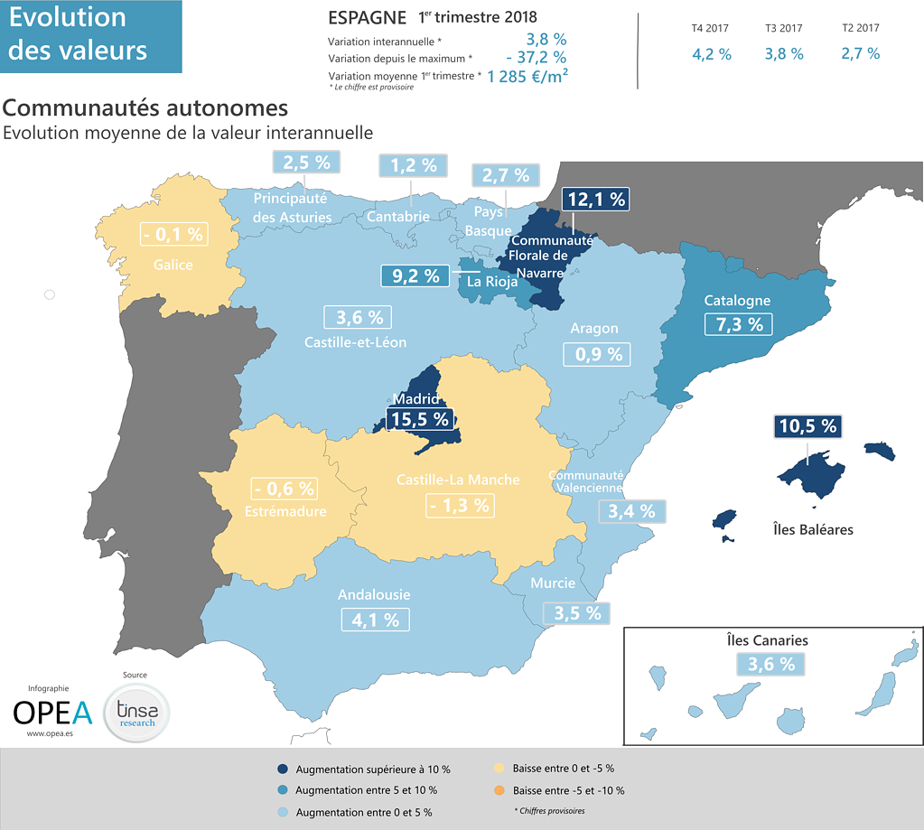 Du côté des régions, c’est dans la Communauté de Madrid qu’a été enregistrée la plus grosse augmentation, la valeur moyenne a grimpé de 15,5 % par rapport au premier trimestre de l’année dernière. C’est ensuite la Navarre qui a marqué le premier trimestre 2018, avec une croissance interannuelle de 12,1 %, suivie en troisième position des Îles Baléares, avec 10,5 %.