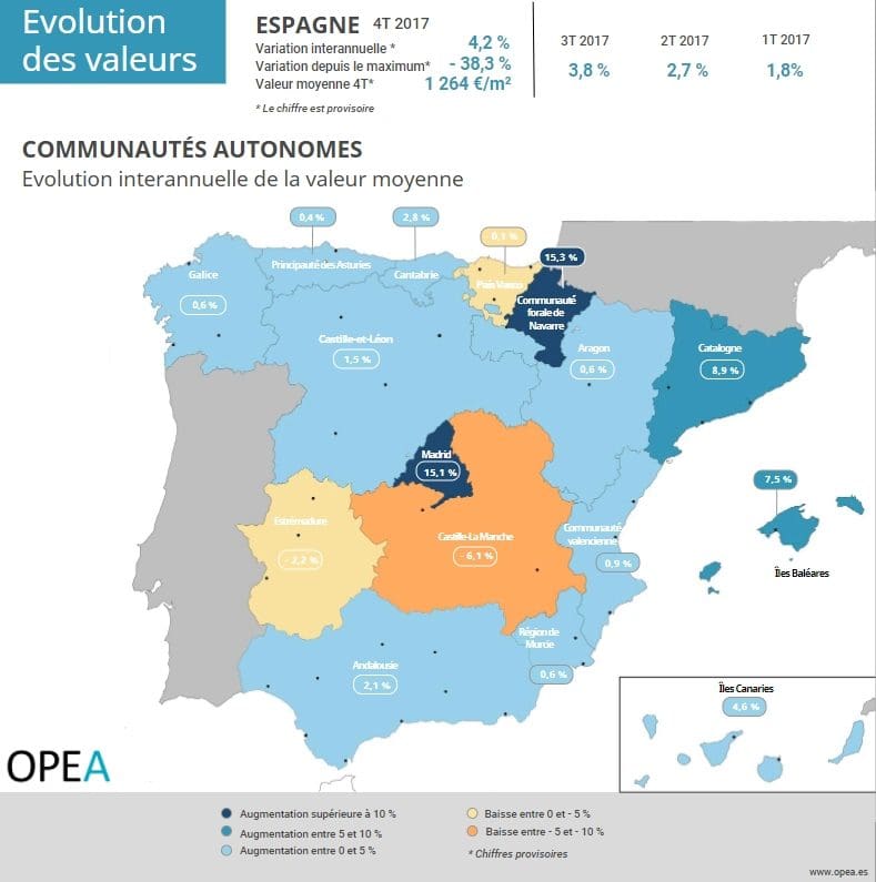 Selon une étude parue sur le site de chasseurs immobiliers OPEA, l’activité immobilière des communautés autonomes sur le dernier trimestre 2017 est en hausse de 4,2 % par rapport à l’année dernière. Avec un prix au mètre carré de 1 264 euros pour un logement fini, la tendance de croissance modérée se confirme sur le marché espagnol.