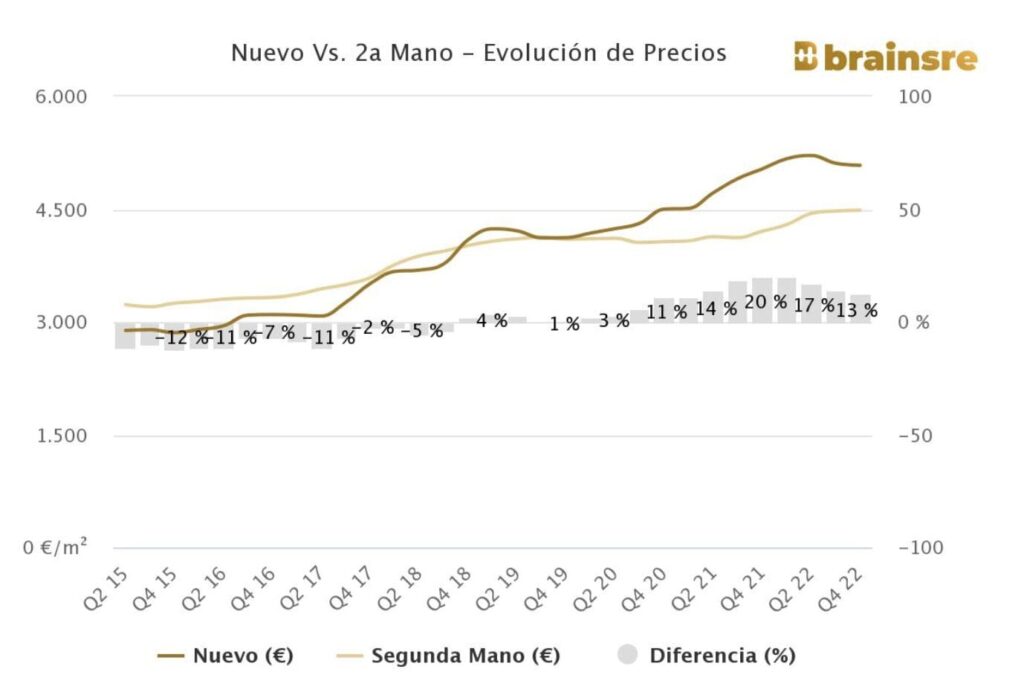 Si nous analysons d’une part les nouvelles constructions, nous constatons que le prix s’élève à 5 083 €/m2, ce qui signifie qu’il a augmenté de 0,9 % au cours de l’année dernière, tandis que le taux d’un trimestre à l’autre a diminué de 0,5 %.