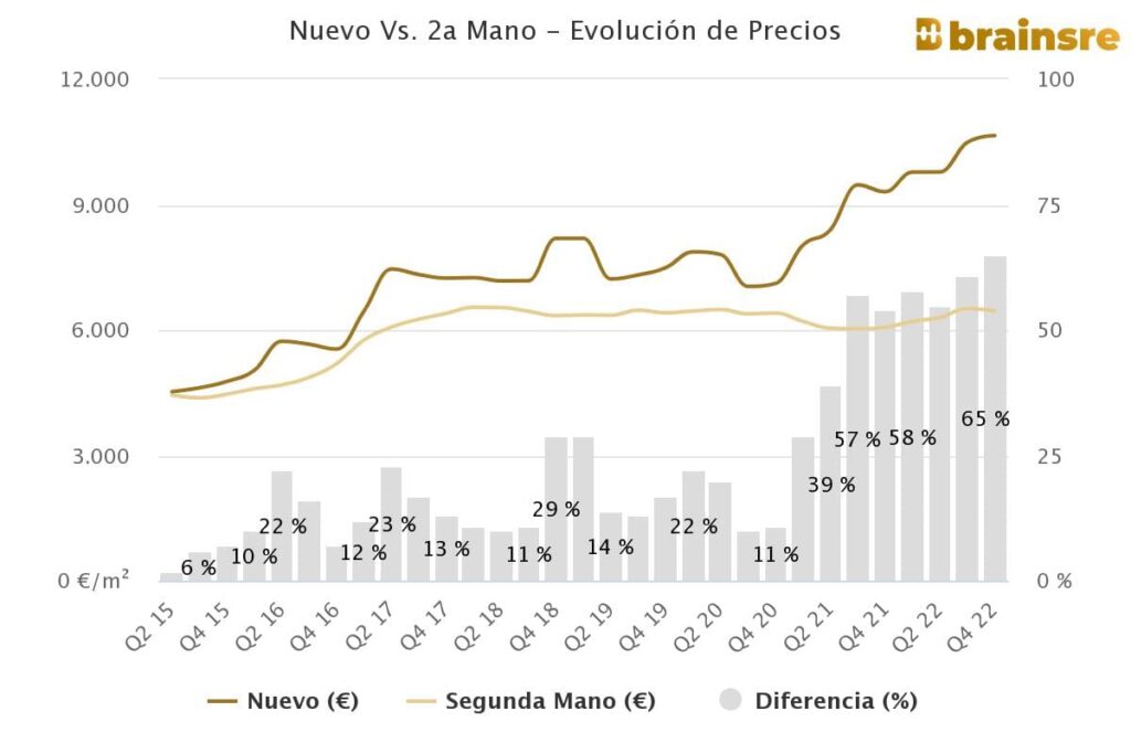 Le prix de vente moyen des logements dans notre pays est actuellement de 1.966 euros par mètre carré, ce qui représente une croissance de 5,3% en glissement annuel, selon les données de la plateforme de big data immobilière Brainsre. Dans le même temps, les nouvelles constructions ont atteint 2.643 €/m2, tandis que les logements d’occasion sont à 1.960 €/m2.