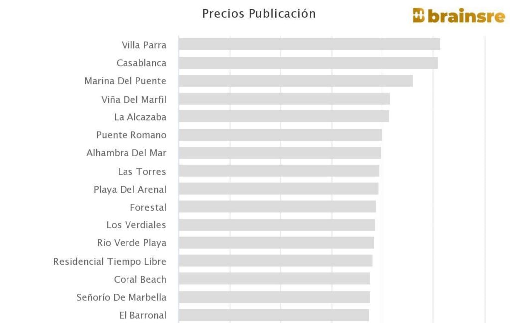 Si nous analysons les prix des différents quartiers qui composent cette commune de la Costa del Sol, nous constatons que celui qui affiche les prix les plus élevés est Villa Parra, avec un prix moyen de 10.311 € par mètre carré. Il est suivi par Casablanca (10.179 €/m2) et Marina del Puente (9.231 €/m2).