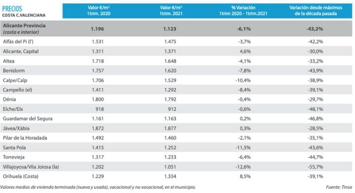 Alentour d’Alicante plus en détails (Chiffres Tinsa)