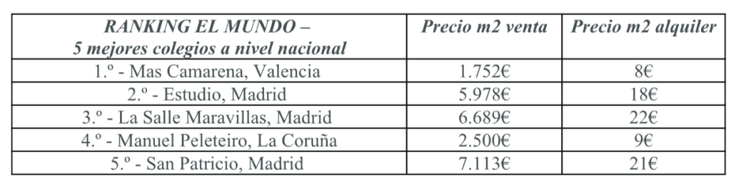 Les résultats montrent qu’une maison multifamiliale située à proximité de l’école classée comme la meilleure du pays, Mas Camarena, à Valence, présente les prix de vente (1.752€/m2) et de location (8€/m2) les plus bas des 5 meilleures écoles d’Espagne. Manuel Peleteiro (La Corogne), en quatrième position, a le 2ème prix de vente le plus bas (2.500€/m2) des écoles analysées. À l’opposé, habiter près de San Patricio, dans le quartier de Chamartín et à la 5ème place du classement, serait l’option la plus chère, avec un prix moyen au m2 dans les rues qui entourent le centre de 7.113€. Dans le cas de l’école La Salle Maravillas, également située dans le quartier Chamartín de Madrid et classée 3ème meilleure école d’Espagne, le prix moyen du m2 est de 6.689€. Pour sa part, l’école Estudio (Madrid), en 2ème position, affiche un prix moyen de 5.978€/m2.