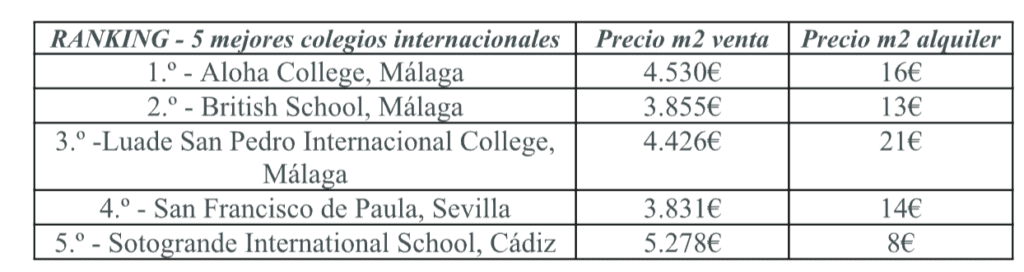 Le classement El Mundo établit également les meilleures écoles internationales. C’est à proximité de l’école internationale de Sotogrande, à Cadix, que le prix de vente moyen est le plus élevé, avec 5.278€/m2. Par rapport à la moyenne du district (3.312€/m2), la réévaluation atteint 37%.
