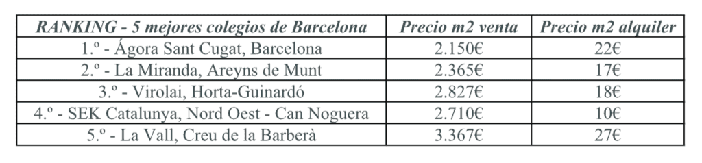 Dans le cas des meilleures écoles de Barcelone, selon El Mundo, les propriétés ayant le prix de vente le plus élevé (3.367€/m2) sont celles situées près de l’école La Vall, la 5ème meilleure de Barcelone et située dans le quartier de Creu de Barberà, où le prix moyen est de 1.653€/m2. Ainsi, les logements proches de l’école sont réévalués de 51% par rapport au quartier. Si l’on analyse le prix de la location, à proximité de l’école, il est jusqu’à 50% plus cher que la moyenne du quartier (13,5€/m2).