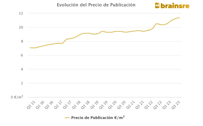 D’autre part, le marché de la location atteint un niveau record, comme le montre le graphique ci-dessus, avec un prix de 11,4€ par m2 et par mois. Au cours des 12 derniers mois, il a enregistré une croissance de 9,7% et au cours du dernier trimestre de 1,3%.