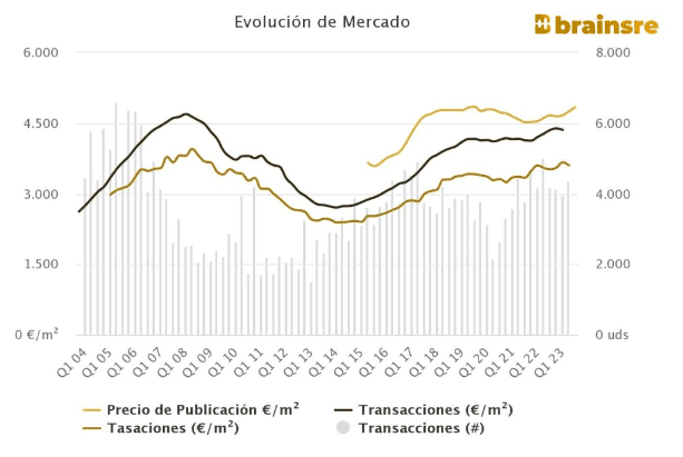 Le prix de vente des logements à Barcelone s’élève actuellement à 4.836€ par m2. Au cours des 12 derniers mois, les prix ont augmenté de 3,7%, tandis qu’en glissement trimestriel, ils ont augmenté de 1,8%, selon les données obtenues auprès de la plateforme de big data immobilière Brainsre.