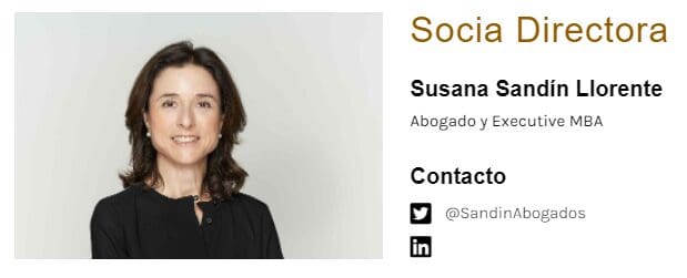 L’équipe de SANDIN ABOGADOS. Real Estate. est dirigé par son associée fondatrice, Susana Sandín, avocate spécialisée en droit immobilier. Susana possède une vaste expérience professionnelle dans le secteur juridique de l’immobilier, dans lequel elle a travaillé pendant la majeure partie de sa carrière au sein du cabinet, en tant que juriste interne pour des promoteurs et des fonds opérant en Espagne et à l’étranger.