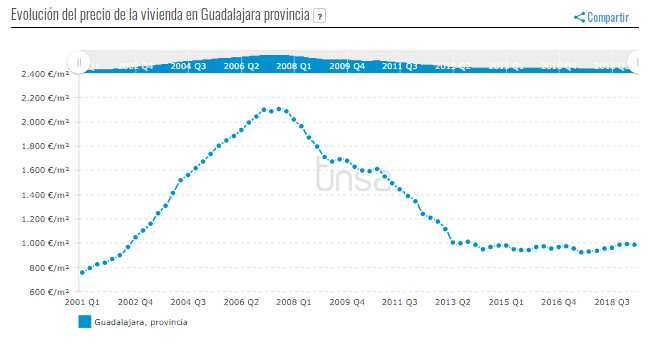 Le prix du logement dans la province de Guadalajara a connu une croissance annuelle de 3,4% au deuxième trimestre de 2019, atteignant 982 euros / m². Des valeurs maximales atteintes en 2007, la valeur des appartements dans la région s’est dépréciée de 53,3%. Le marché résidentiel a évolué de manière négative par rapport à ce que nous avions en 2019. Le prix au deuxième trimestre de 2019 est de 0,4%, un chiffre inférieur à celui enregistré à la même période de l’année précédente.