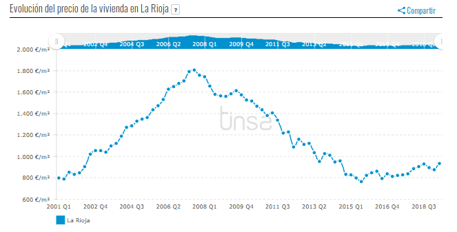 Le prix du logement dans la province de La Rioja a connu une croissance annuelle de 3,4% au deuxième trimestre de 2019, jusqu’à 933 euros / m². Par rapport aux valeurs maximales atteintes en 2007, la valeur des appartements dans la région s’est dépréciée de 48,2%. Le marché résidentiel a évolué de manière positive depuis 2019. Le prix au deuxième trimestre de 2019 est de 4,2%, un chiffre supérieur à celui enregistré l’année précédente sur la même période.