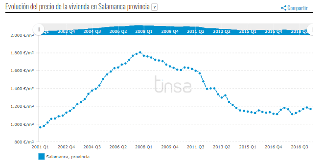 Pour analyser le niveau actuel des prix du logement par rapport à 2001, Tinsa a généré un indice basé sur 1.000 points en 2001. En ce qui concerne cette référence, le prix du logement dans la province de Salamanque sur le deuxième trimestre de 2019 s’élève à 1.164 points.