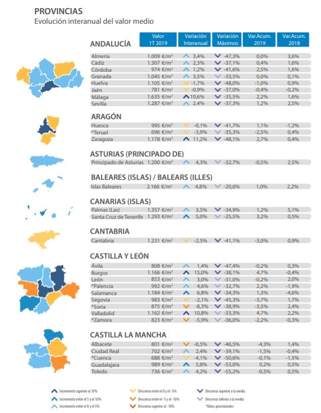 On remarque que les valeurs provinciales les plus élevées se trouvent à Guipúzcoa (2 353 €/m2) , Madrid (2 313 €/m2), Barcelone (2 186 €/m2) et les îles Baléares (2 166 €/m2), tandis que le prix moyen le moins cher parmi les provinces espagnoles est situé à Cuenca (688 €/m2), Teruel (696 €/m2), Ville royale (702 €/m2) et Lugo (728 €/m2).