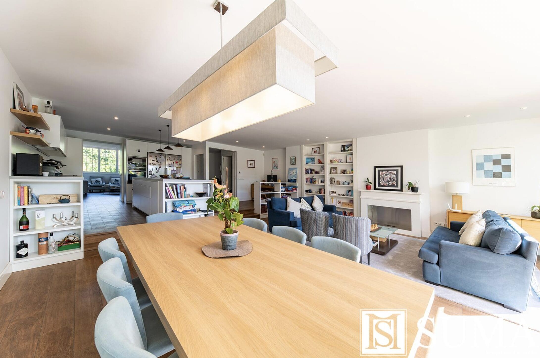 Au premier étage, nous trouvons un grand hall à partir duquel nous accédons à la cuisine intégrée au salon, et de là par une grande fenêtre au terrain avec piscine privée.