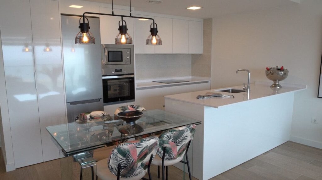 Cuisine équipée avec lave-linge, réfrigérateur, four, plaque vitrocéramique … Tout est prêt pour que vous puissiez commencer à préparer vos recettes préférées tout en regardant vers la mer.