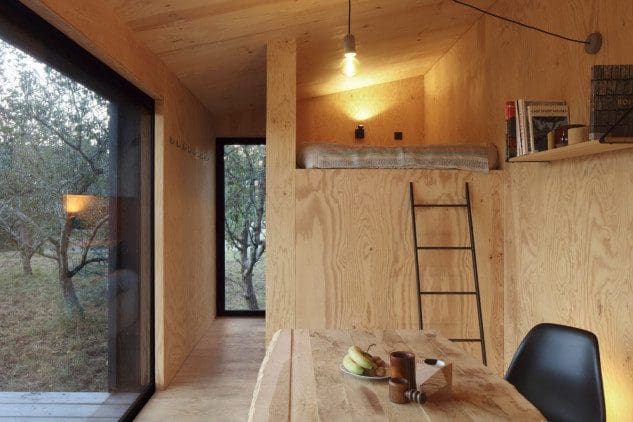 Son design est divisé en trois espaces distincts. Le salon central dispose d’une cuisine intégrée avec un petit poêle et un évier, avec la salle de bain positionnée d’un côté, de l’autre, il y a un coin nuit avec deux lits superposés, l’un accessible depuis le salon et l’autre depuis l’un petite pièce séparée.