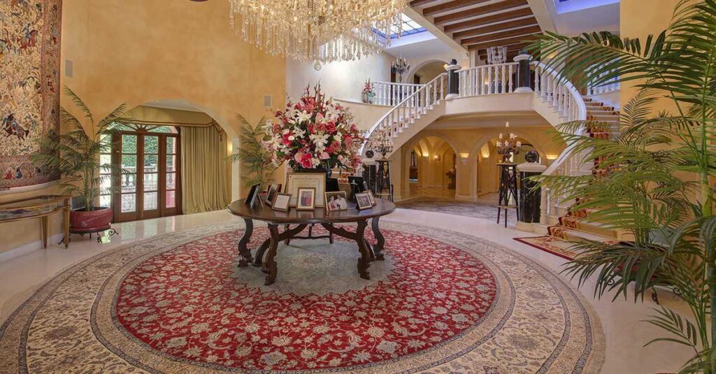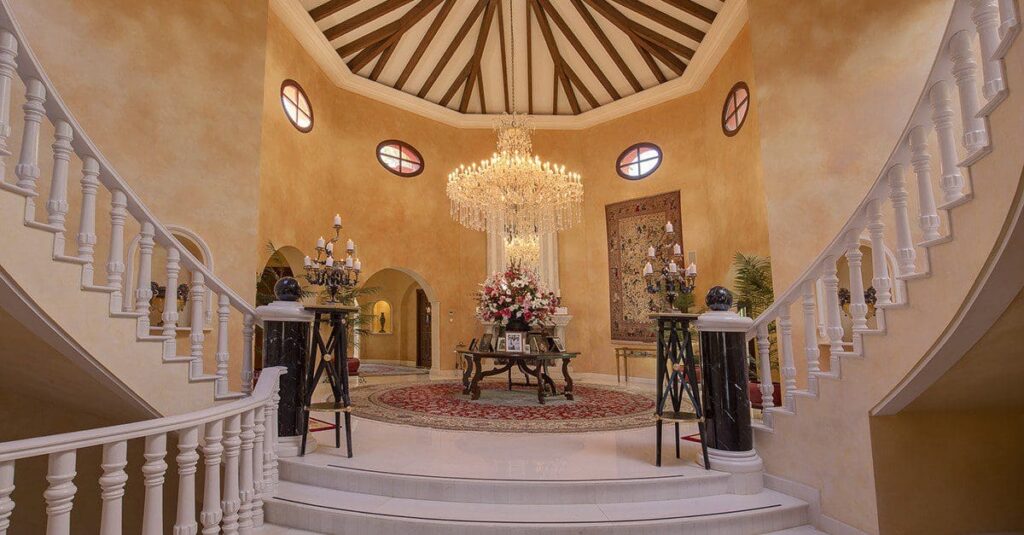 Avec un terrain de 9.000 m2, et une surface totale de ce palais de 3.315 m2, il dispose de 12 chambres et 19 salles de bains, d’un grand salon, d’une cuisine équipée de meubles et d’appareils électroménagers de qualité supérieure et de plusieurs terrasses. Il dispose également d’un gymnase, d’un sauna à l’étable, d’une grande piscine chauffée, ainsi que d’une piscine intérieure. L’extérieur est entouré d’un jardin et de dizaines de palmiers et autres arbres.