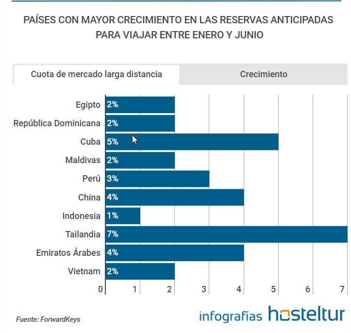 Les réservations pour les vols intercontinentaux en provenance d’Espagne montrent une croissance de 4,4% au premier semestre de 2018 par rapport à la même période de l’année dernière, selon un rapport de ForwardKeys, une société spécialisée dans le suivi des réservations aériennes. Les croissances les plus remarquables profitent à des destinations telles que l’Égypte, Cuba, la République dominicaine et la Thaïlande.