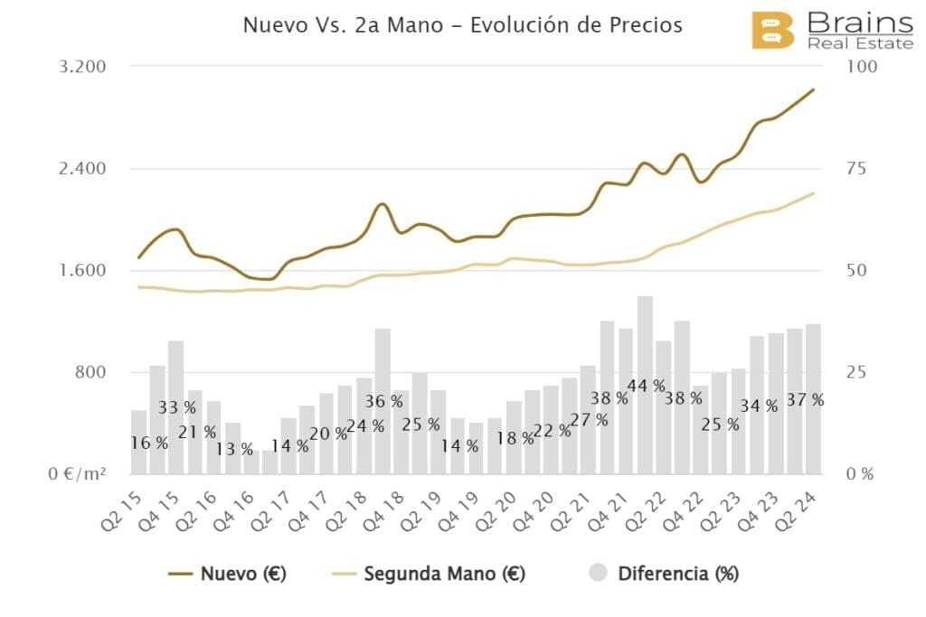 Actuellement, le prix s’élève à 2.207€/m2, après avoir enregistré une croissance de 10,3 % en glissement annuel, tandis qu’au cours du dernier trimestre, il a progressé de 3,1 %, selon les données extraites de la plateforme de big data immobilière Brainsre.