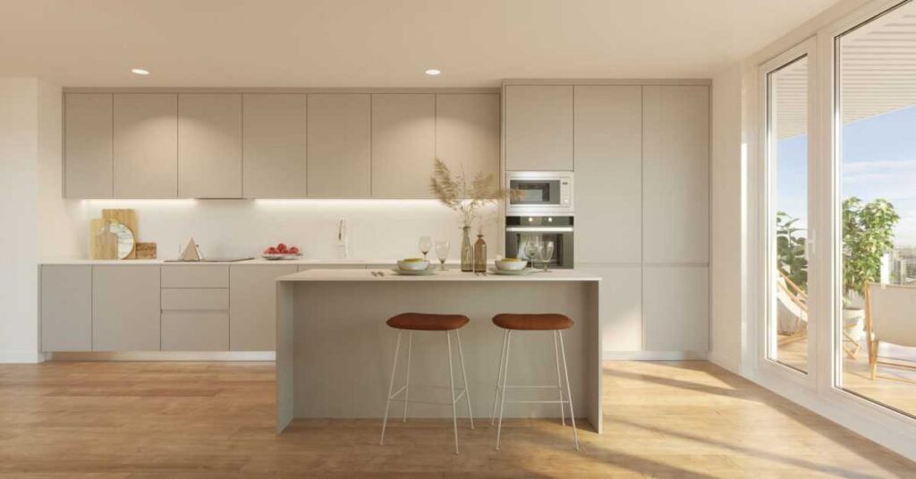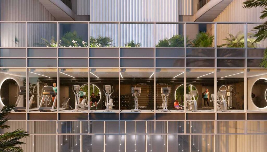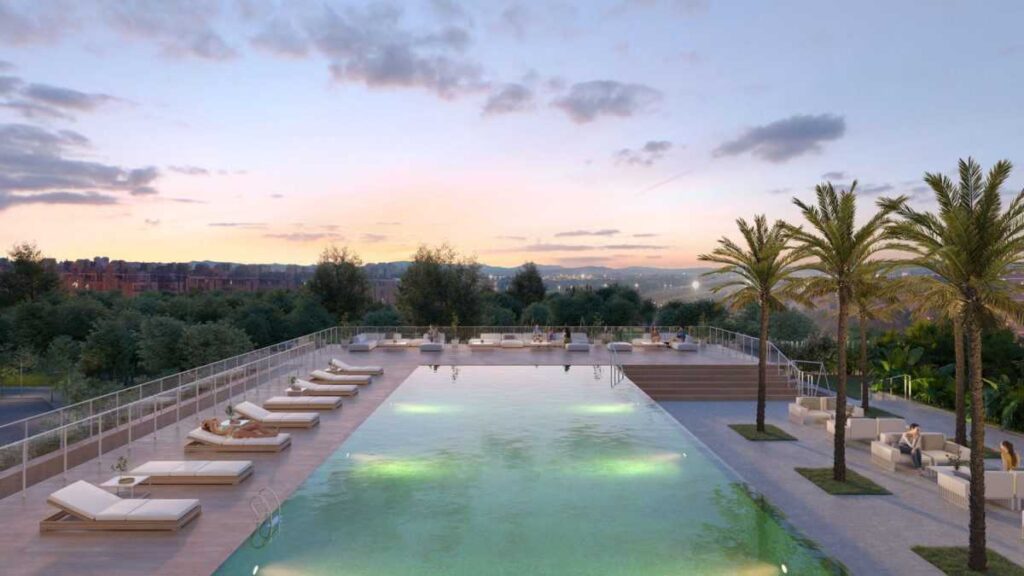 L’intérieur du bâtiment se caractérise par ses grandes fenêtres et ses espaces ouverts, tandis que l’élément le plus caractéristique des espaces communs d’Ikon est une impressionnante piscine commune avec solarium, ainsi qu’une salle de sport et un espace social gastronomique.