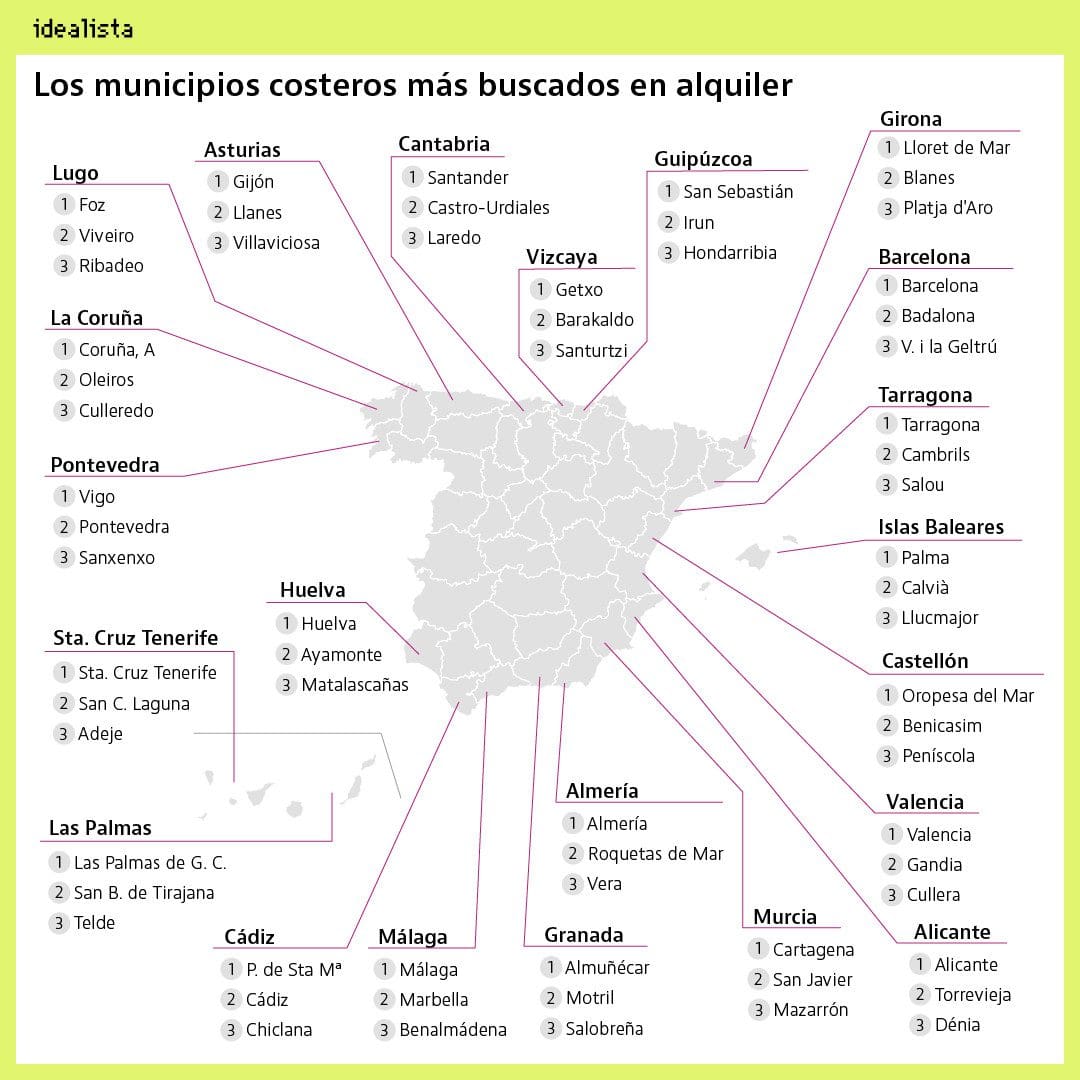 Les zones côtières ont généralement un marché du logement actif, à la fois pour la vente et la location. En utilisant le nombre moyen de visites mensuelles au cours du deuxième trimestre 2021, chez idealista, nous avons préparé ce classement des municipalités les plus recherchées dans les provinces côtières pour louer une maison. Dans les 21 provinces côtières espagnoles, la capitale est la commune la plus demandée, mais il y a quelques surprises.(Idealista)
