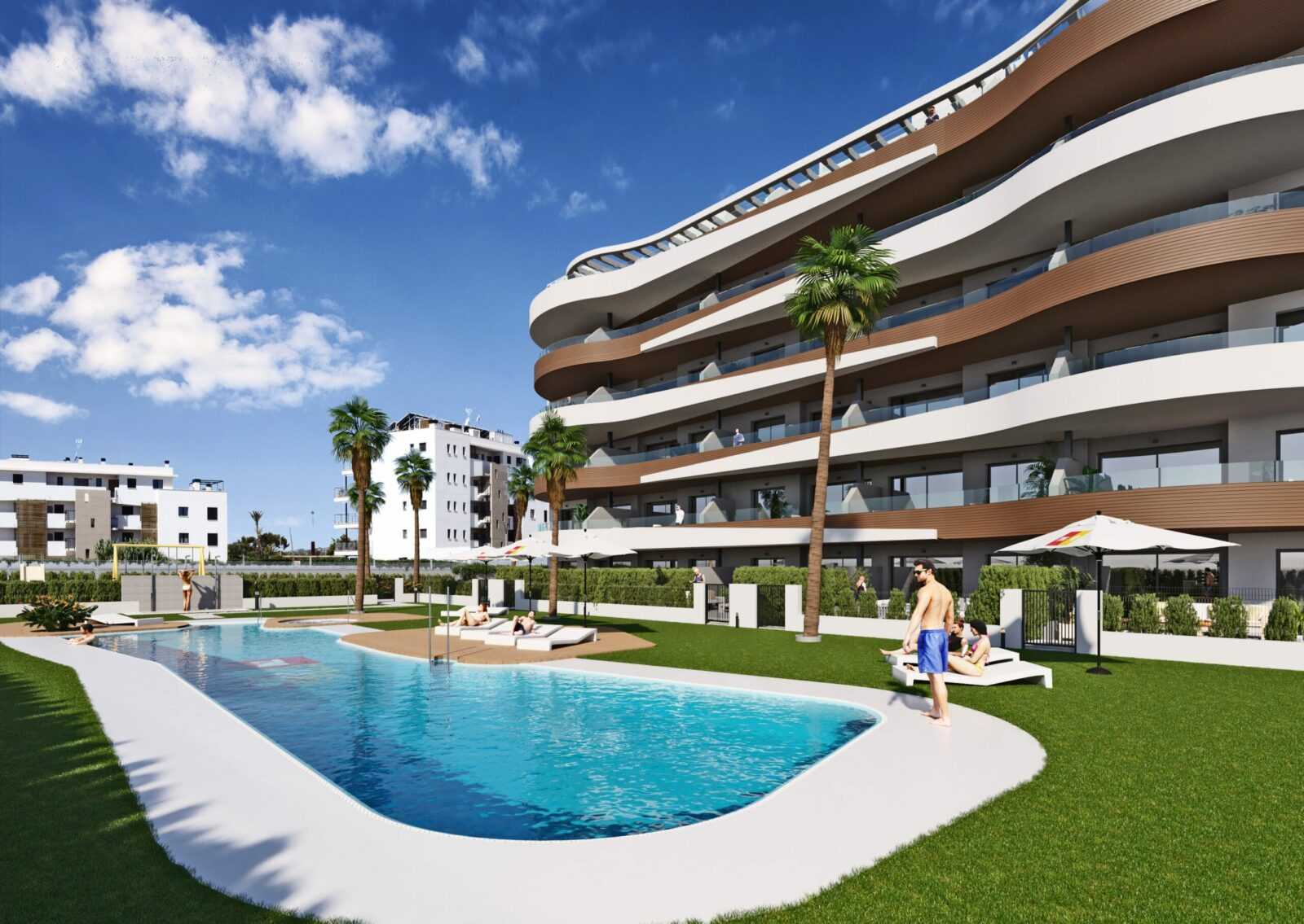 Le projet comprend des appartements et des penthouses avec solarium, dotés de 2 et 3 chambres à coucher et 2 salles de bain, ainsi que d’un parking extérieur et/ou en sous-sol avec une cave. La propriété est clôturée, ce qui vous permettra, à vous et à votre famille, de profiter de ses excellents espaces communs avec : piscine pour adultes et enfants, jacuzzi, aire de jeux, espace vert intérieur et chemins intérieurs.